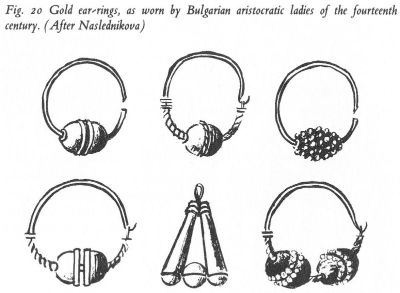 Fig. 20 Gold ear-rings, as worn by Bulgarian aristocratic ladies of the fourteenth century. (After Naslednikova)