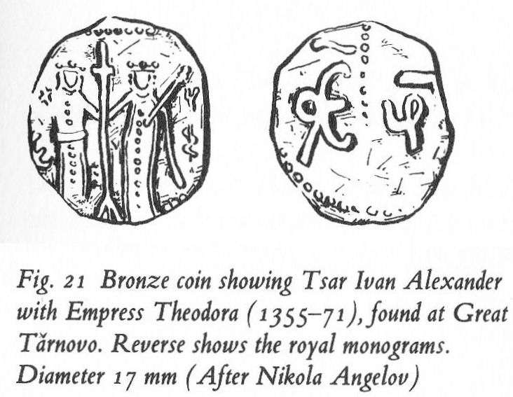 Fig. 21 Bronze coin showing Tsar Ivan Alexander with Empress Theodora (1355-71), found at Great Tărnovo. Reverse shows the royal monograms. Diameter 17 mm (After Nikola Angelov)