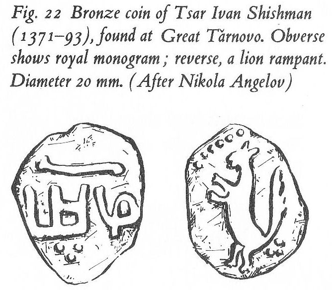 Fig. 22 Bronze coin of Tsar Ivan Shishman (1371-93), found at Great Tărnovo. Obverse shows royal monogram; reverse, a lion rampant. Diameter 20 mm. (After Nikola Angelov)