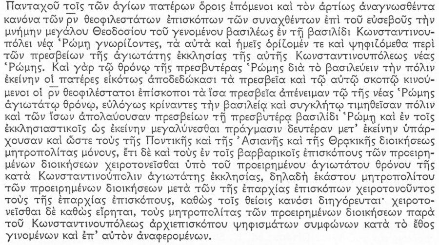 “Moreover we have confirmed the canon of the one hundred and fifty Fathers, who were assembled at Constantinople in the time of Theodosius the Great, of happy memory, which defines that the see of Constantinople shall have privileges so as to rank second after your own most holy and apostolic see, in the assurance that, as with your accustomed interest you have often shone your brilliant apostolic radiance even upon the Church of Constantinople, you will increase it many times, since you share your own privileges ungrudgingly with your brethren.”