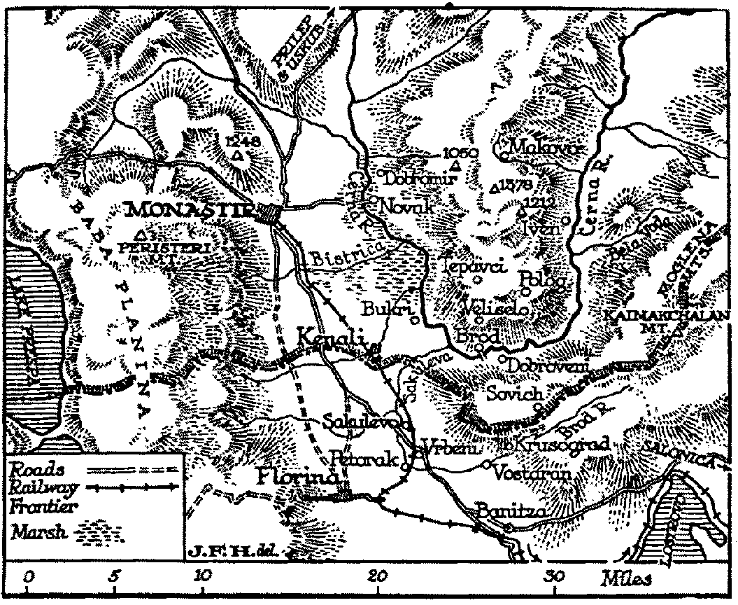To co-operate with this attack which was to follow a N.E. direction from between Lakes Prespa and Ochrida, a converging attack north-westwards was ordered from Monastir, and the dominating Hill 1248, the chief among the complex heights which overlook the town from the north, was won, with 400 prisoners, which were in addition to 1,400 more captured by the French in that week at a cost of comparatively small casualties to themselves. But the crest of 1248 could not be maintained, and French, and Bulgars remained each hanging on to the opposing slopes of the mountain, the summit remaining part of No Man's Land. But though the villages of Snegovo and Kirklina and a considerable section of the enemy first line was won, the Bulgars and Germans were still within shell-range of the town, and no further progress had been made towards Resna.