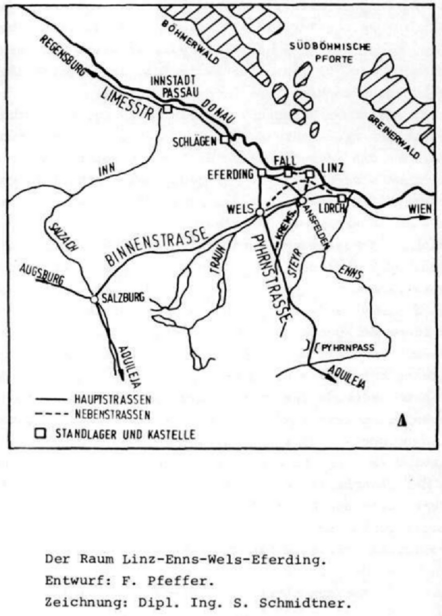 Den Ausschlag für die nicht geringe handelspolitische Bedeutung von Lorch gab natürlich dessen Verkehrslage. Lorch befindet sich nämlich in der Schnittlinie mehrerer morphologisch von der Natur vorgezeigter Straßenzüge, die bereits vorrömisch begangen wurden. Man trifft hier zum einen auf die große Ost-West-Transversale längs der Donaufurche, auf die der Donau folgende UferLimes-Straße, welche über Eferding nach Passau führte [106]. Zum anderen trafen sich hier mehrere Nord-Süd-Linien, einmal - im Süden - die längs des Traunflusses nach Ischl führende Salzstraße, dann - im Norden - jenseits der Donau ein in der Aistfurche verlaufender bequemer Zugang nach Böhmen, darüber hinaus, die Enns entlang, die Straße zum norischen Eisen. Von allergrößter Tragweite aber war die schon in römischer Zeit ausgebaute Pyhrnstraße, die nach Virunum und letzten Endes bis nach Aquileja führte. Sie war schon zur Römerzeit eine der Hauptverkehrsadern des Noricums [107]. Die verkehrsgeographische Lage Lorchs läßt somit sagen, daß dieser Ort innerhalb der oberösterreichischen Nord-Süd- und Ost-West-Pfortenstellung einen der prominentesten