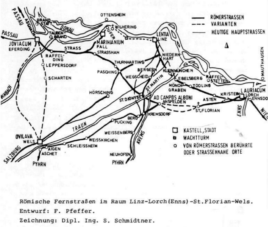 118. Ebda. 550, 580. - Etwas anders Jandaurek 347 ff., nach dessen Ansicht die alte 'Hörstraße' an St, Florian vorbeizieht, was besagt, der Ort St. Florian habe in vorbairischer, also römischer Zeit noch nicht bestanden; erst nach Gründung des Stiftes sei es notwendig geworden, dieses durch eigene Wege an das bestehende Verkehrsnetz anzubinden. Die von Jandaurek genannten Abweichungen sind indes so minimal, daß das von Pfeffer Gesagte nicht unbedingt falsch ist.