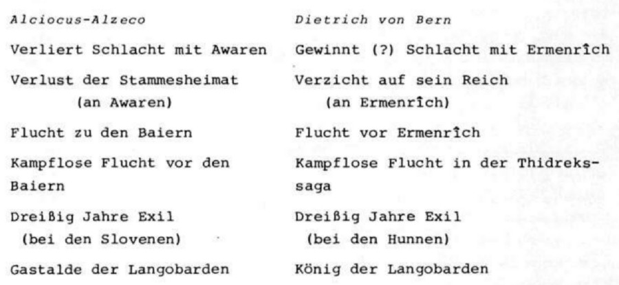 Die grundlegenden Bestandteile der Gleichung Alciocus-Alzeco = Dietrich sind in jedem Fall das bisher für den Berner vermißte Fluchtmotiv und die durch Fredegar sowie Paulus Diaconus bestätigte Exildauer von dreißig Jahren. Von gewiß entscheidender Bedeutung ist ferner der Hinweis auf die Langobarden und nicht zuletzt die Ansiedlung des Dietrichsagenstoffes im Donau-Alpenraum. Nicht zu vergessen ist außerdem das im Nibelungenlied noch deutlich erkennbare Motiv des freien Abzuges für Dietrich und seine 600 Männer (1995) , das gut mit der Flucht des Alciocus und seiner 700 Anhänger übereinstimmt.