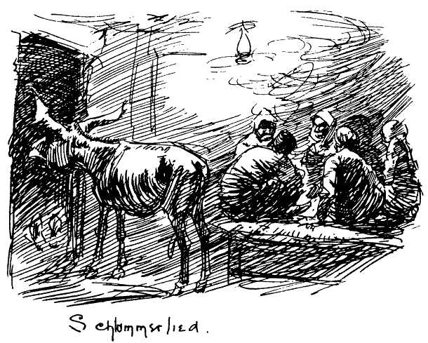 With smarting eyes I groped through the smoke towards the "window," a two-foot square hole in the wall on the floor-level, and having tumbled over a three-legged stool, sat on it, feet stretched out towards the wood fire in the middle of the hard earth floor. Using one smoke to keep out another I lit a pipe, and by degrees made out the hostess hanging up our garments to dry. Moro crawled in, and we sat coughing and blinking at the native bread-making. A flat round earthen dish, about two feet across, was made red-hot on the fire, then taken off and the dough slapped into it. Then they buried a lid in the embers, and when hot enough, put it on the top of the dough. This prehistoric oven turns out a fine crust, but the middle of the loaf is very pasty.