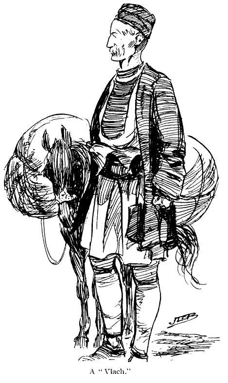 Good fellows those Vlachs - a wandering tribe from Wallachia who roam the mountains from end to end of Macedonia with their rats of ponies, doing most of the carrying trade of the interior. Hillmen and horse-lovers - grave and little given to speech; striding in their white kilts and long blue coats, with a bird's-eye cloth wound turban-fashion round their heads. Generally they have well-cut features and a long fair moustache, and their blue eyes - puckered at the corners in a hundred wrinkles - look you straight and honestly in the face. They are mostly Roman Catholics, and are the only native people who do not