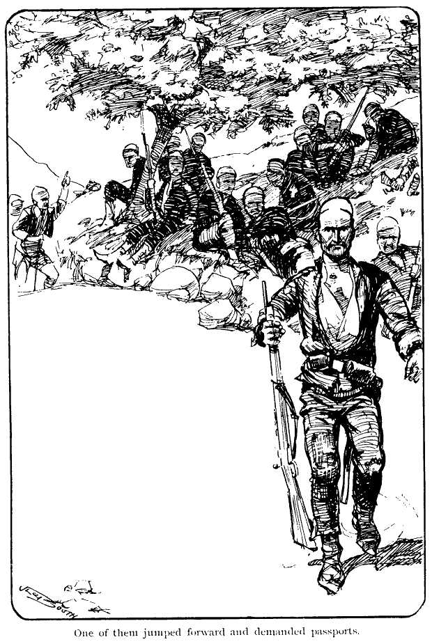 One of them jumped forward and demanded passports. I told him we only showed them to officers, on which he answered that there was no officer for miles, and he intended to see them then and there. The "high and haughty" seemed the game to play, so we cocked our hats, put on enough "side" for a sergeant-major, and started to swagger off up the track. I think the "grand air" might have succeeded, but at that moment the Arnauts from the watering-place arrived, and in six words had set the whole gathering against us. They all got on their legs and swarmed round growling, and for a few minutes things looked rather nasty. Suddenly - seeing bayonets and whatnots uncomfortably near him - a happy thought was born in Sandy's noddle.