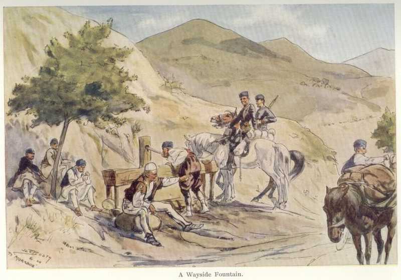 Chewing a leathery bread-crust from a forgotten pocket to create saliva, we went limping on till at last - there it was! A real running spout of cold water, sticking out of a tree stump and pouring into a trough. Of course we ought to have rinsed our mouths out and gone on, and of course we drank a quart apiece and bid good rules go to the devil. Here, whilst we rested, a gang of Arnauts [Albanians.] joined us - insolent rascals according to Sandy's translation; we gave them the cold shoulder and forged ahead. Serpentining through a rocky defile, where the going was execrable, we came out bang