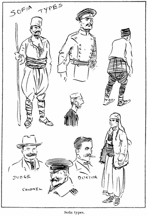 THE Capital of Bulgaria is young, well grown for its age, and mighty proud of itself. A trifle gawky yet, and having outgrown its clothes a little where its long limbs of electric-tram lines ramble out past scattered, half-built houses to the open country, and suddenly break off, wondering why they have come so far. The town is working all the time, and the main street is positively busy. It has a South of France look; white house-fronts, persienne - shuttered windows, and acacia trees shading the buzzing café-tables along the footway. Brown and grey-clad troops, officers on curvetting little Hungarian horses, dark-blue Mounted Police, and gay-coloured market-folk with their bullock-carts pass in the roadway; the noise of drums and bugles and the "clang, clang" of electric-tram gongs are in the air.