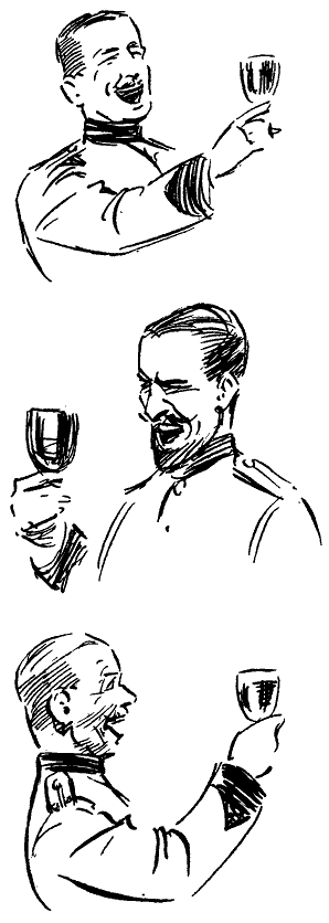The regimental songster now came on, and produced familiar friends from Faust and Il Trovatore with great strength and without accompaniment. Then Skip and I put up "A hot time in the old town tonight" - alack! that our "war-drum" had had to be left behind in Sofia - and more classic song of the same ilk. A fine warlike ballad in Bulgarian, with a fiery chorus of all the gallant Gunners, cleared the way for the big plum of the evening, a fighting-drinking song, the first verse of which might be roughly put down as
