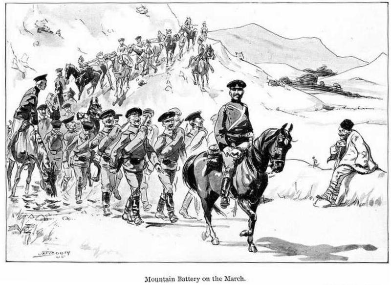 "It's only the pick of the Army that handles the dear little pets."To each gun four ponies. The leader carries the carriage, the second wheels and shafts, the third the gun (in one piece), and the fourth the ammunition. The folding shafts carried by the second pony can be fixed to the trail of the gun, so that it can be shifted about by one animal. The little four-legged gunners - all mane and tail - are obviously proud of their job, and know their drill as well as the men. The long snaky body twined up the rough hill-path at a good pace and came at last to a big stretch of rolling down-land. The Major shouted a word of command, the ponies turned sharp right and halted as the men flung themselves on the gun parts, tore them from the saddles, wheels clacked on to axles, the little gun jolted into the trunnions whilst the shafts were fitted to the trail, and in twenty seconds every man was standing steady. Six dwarf guns looked stolidly across the valley. The ponies, with flapping straps and clinking buckles, were trotting rearward over the hill crest.