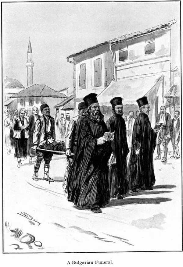 Last came women and girls and a few men walking in order, some of them singing. The men at the shop-doors and the waggoners took off their caps and looked on the ground, chin on chest. The little company trudged on in the sun to the cemetery at the outskirts of the town, some of the street people joining in at the tail end and lifting their voices with the rest. The Bulgarians always carry their dead so, for all men to see; sometimes they are in the open coffin, and a boy walks in front carrying the lid.