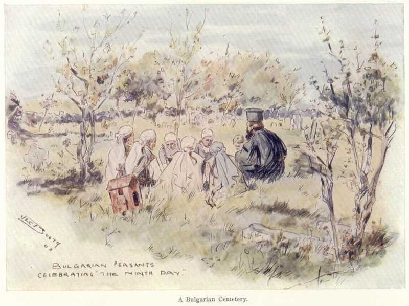 The ceremony of eating and drinking round the grave takes place each successive ninth day after a relative's death. This is kept up, I think, for a year. The Bulgarians generally lay a large stone shaped like a coping-stone on their graves, and the head-stones are mostly short thick crosses. Others are of wood, and many graves have no mark at all.