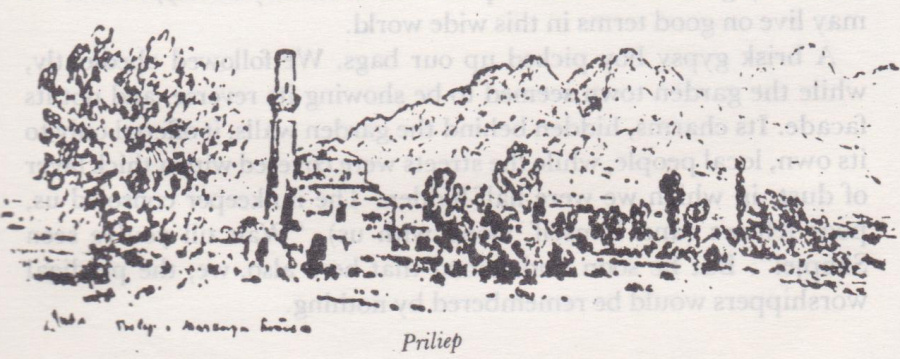 The Pelagonia valley, a compact, green corn area, between the magnificent limestone ridges in the distance, was barred by basalt rocks, which like an indented steel rasp, were stuck in the grey azure of the sky. The irregular ruins of the teeth resembled lined up soldiers. A white point gleamed on the height — the Treskavets monastery. Later, from the village, the features of the castle could be discerned. In the lowlands, enclosed by a huge amphitheater, the railroad coiled and twisted towards Gradsko, and on the green carpet below, we saw the smiling face of the town, a garden, which was a magnificent contrast to the gigantic rocky surroundings. A few broken down minarets, with clock and church towers, were sticking out of the dark-green surface of the dense trees, among which the familiar, charming, Greek-type houses, with their eaves hanging low, lay half hidden (they had numerous large windows, spacious verandahs, and wide, shady eaves).