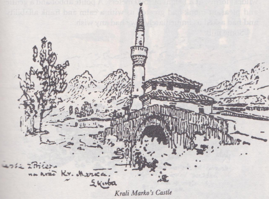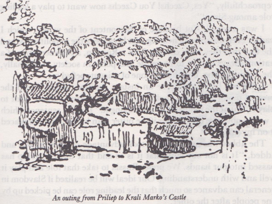We relaxed contentedly, Yes, the great hero, whose name and deeds filled the minds and the hearts of all South Slavs, could have been born here, the soil was as he had wanted it (he had refused to plough in a soft soil). As it is said in the song, he had helped his father (King Vulkashin) to clear the forests, and while the father had gone home at noon, to fetch a pitcher of water, the son had cut all the trees. We agreed that the castle, with its sharp, pointed rocks, whose enormous walls resembled fairy-tale dragons, was quite appropriate for the wood-nymphs that had followed Marko, mounted on stags, which they had lashed with poisonous snakes.