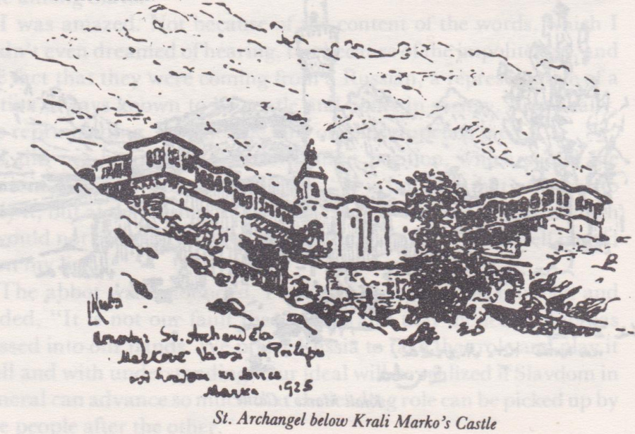 I didn't know what the basis of the legend, was, that the hero of the South Slavs had founded the monastery. But if the building with its appearance didn't represent its patron, the winged St. Archangel, then it must have been an involuntary expression of the flight of the essence of Marko's poetic image. The impression could not be diminished even by the images in my mind of Ostrog in Montenegro, St. Petka in Ohrid, St. Illiya in Skoplje, and other southern monasteries, which also resembled aeries hanging from the rocky walls. This one, though, resembled an eagle about to fly off.