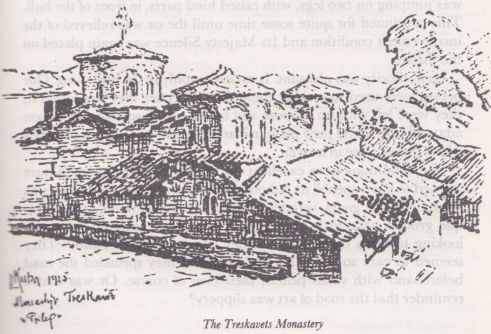 What had been before that was not known. It was certain only, that the church and the whole monastery were much older. During Miliutin's time the churches had been built with a nave and two aisles. Here there were actually two basilicas, whose relationship was mysterious, since one was smaller and should have been, according to practice, older. But it was of a later period. The window of the older church was cut from a single stone, showing an Armenian influence found before Miliutin's time and maybe even before Slavic time. Some common characteristics with Bulgarian churches, as for example those in Stanimaka and Bachkovo, indicated the time of the Bulgarian Tsars, the Assen, whose authority had covered the region. The narthexes, originally designated for the "repenting" and chiefly for newly christened pagans, had already been included in the original plan. The mural paintings were from different ages. In the small church they were from the sixteenth century and in the catacombs (in the southwestern corner) from the fourteenth century. The mural paintings in the central dome were new. The shepherd filled in the scant data by telling me that the monastery had been empty and deserted for seventy years "because the Turks slayed the djatsi and the vladalye (the monks and the high-ranking)". The bloodshed had been awful. An animal had been created from the blood and no one had dared come near because of it. But once lightning had struck the