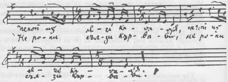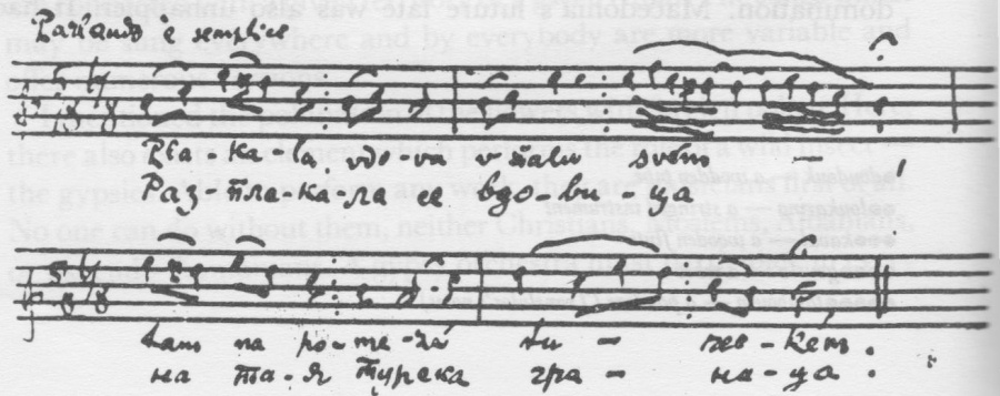 Let us imagine Macedonia, whose Slavic half was full of scattered around alien islands, and all the towns had Albanian, pseudo- Rumanian, Turkish, Spanish-Jewish, Greek, and gypsy quarters. Most of them differed in their clothing and religion, and therefore in their music and songs. That is why we have to define the term Macedonian song.