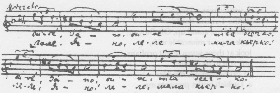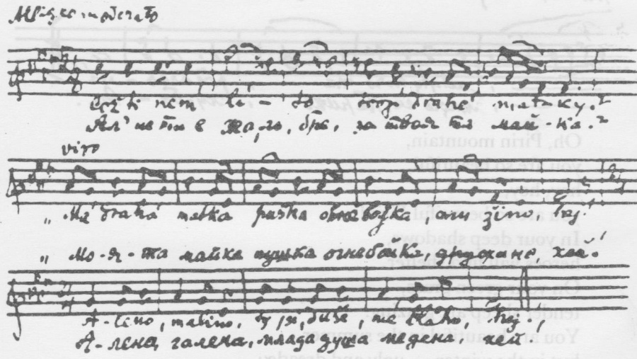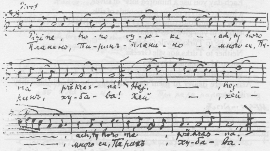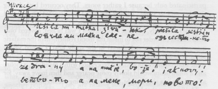 I, myself, understand it as the songs, sung by its Slavic population, and the Slavic lyrics are usually enough for me to classify the song as Slavic. Given the existence of such a national diversity, it is difficut for me to usurp the right to determine what belongs to each people and what is a transitional form. But it is no ill fate when one finds some foreign elements in a song of a different nationality. They only show the degree in which the cultures have merged. When a lot of material has been gathered and studied, the solution will come by itself.