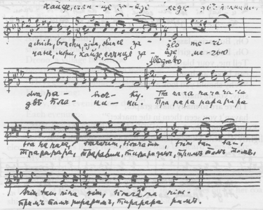I wrote down the note of the songs best, when I was drawing. For example, in Bitolja, in Koukourechen street, I was drawing in a yard and nearby a girl, which was embroidering, was singing. The South Slavic songs were usually long, and while drawing, I could memorise the simple tune, while the long one I had to make out. When I was acquainted with the whole song, it was usually easy to attract the singer to sing it again for me, while I could write it down.