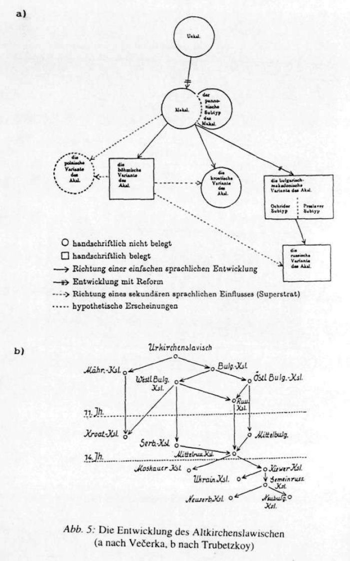 Abb. 5: Die Entwicklung des Altkirchenslawischen (a. nach Večerka, b. nach Trubetzkoy)