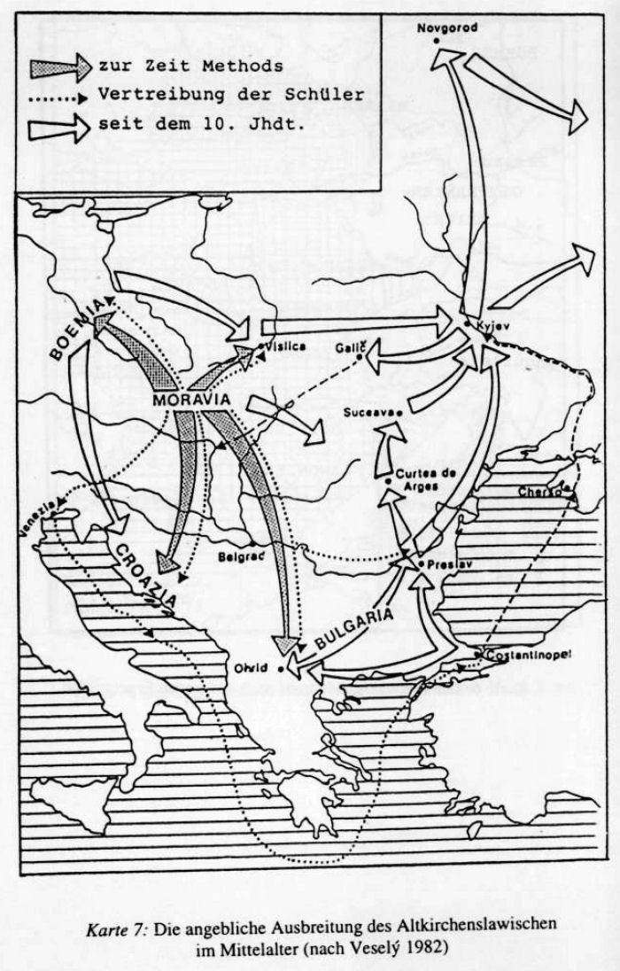 Karte 7: Die angebliche Ausbreitung des Altkirchenslawischen im Mittelalter