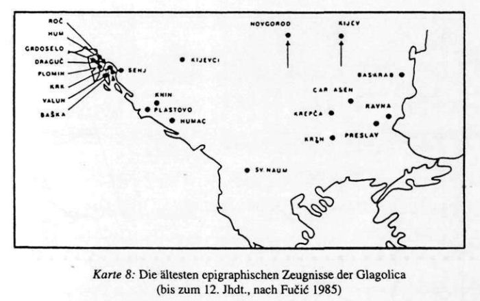 Karte 8: Die ältesten epigraphischen Zeugnisse der Glagolica