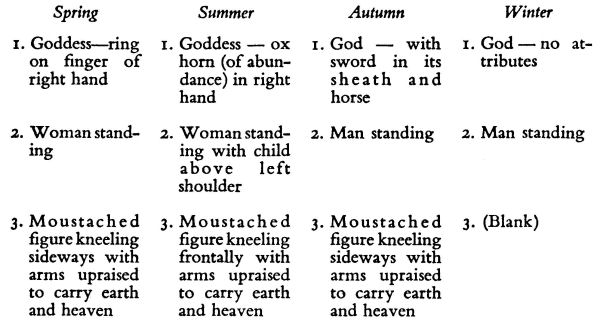 The terrestrial figure below is of the same sex as the deity. The presentation of each side and, according to Rybakov’s interpretation, each season, is as follows :