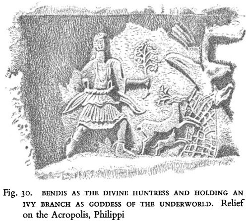 and who also appears in Italy as an Etruscan goddess, [1] possessed four distinct personifications. As a huntress goddess, she was armed with a spear or bow and attended by a hound ; in effect, a Thracian equivalent of Artemis-Diana with qualities that indicate a common origin. As a goddess of the underworld and of death, she appeared holding a branch of ivy, introducing a Thracian link into the chain of legends of a ‘Golden Bough’. As a moon goddess, portrayed with a crescent moon, she pointed to a relationship with the Great Mother concept that had been introduced to Thrace from Samothrace and Asia Minor and which was also reflected in certain aspects of Artemis-Diana. Finally, as the feminine hypostasis of the Thracian Horseman, Bendis could be presented standing with the serpent and an altar surmounted by a pine or fir cone or a flame. [2]