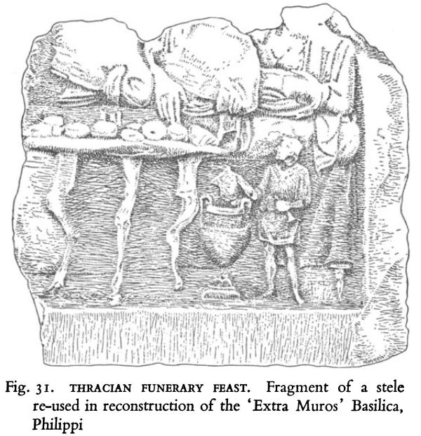 Similarly, the Thracian Horseman and the Funerary Feast were symbols of Thracian belief in an afterlife. The latter motif was common to other areas and combined a primitive pagan form of communion rite with the symbolic provision of food for the deceased.