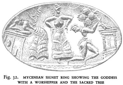 Fig. 32. MYCENEAN SIGNET RING SHOWING THE GODDESS WITH A WORSHIPPER AND THE SACRED TREE
