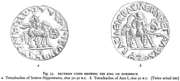 Fig. 33. BACTRIAN COINS SHOWING THE KING ON HORSEBACK a. Tetradrachm of Sotiros Hippostratos, circa 50-30 B.c. b. Tetradrachm of Azes I, circa 30 b.c. (Twice actual size)