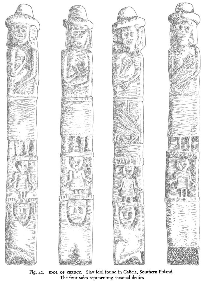Fig. 42. IDOL OF ZBRUCZ. Slav idol found in Galicia, Southern Poland. The four sides representing seasonal deities