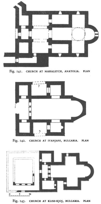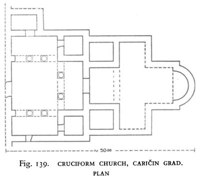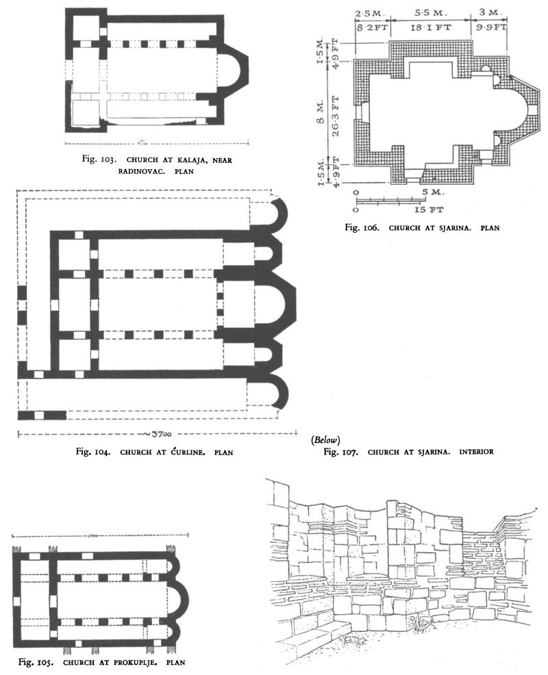 The second cruciform type is a trefoil. One occurs at Kuršumlija in the Church of the Holy Virgin (Fig. 108), another a short distance beyond the southern suburbs of Carion Grad (Fig. 109), and a third at Klisura (Fig. 111). The first two are identical in plan. Both have projecting eastern apses that are rounded inside but three-sided on the exterior, and two others, rounded inside and out, which jut from the middle of the north and south walls. The arrangement of the narthex of the church at Kuršumlija, which was rebuilt in the twelfth century, is not entirely clear, but all available evidence points towards its construction on lines closely similar to that near Caričin Grad, which was excavated by Mano-Zisi a few years ago, and the ground plan of which indicates two rooms jutting north and south of the walls of the nave and enclosing a portico leading from an atrium into the church.