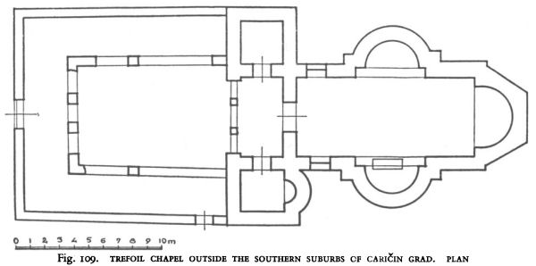 Fig. 109. TREFOIL CHAPEL OUTSIDE THE SOUTHERN SUBURBS OF CARIČIN GRAD. PLAN