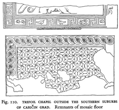 Fig. 110. TREFOIL CHAPEL OUTSIDE THE SOUTHERN SUBURBS OF CARIČIN GRAD. Remnants of mosaic floor