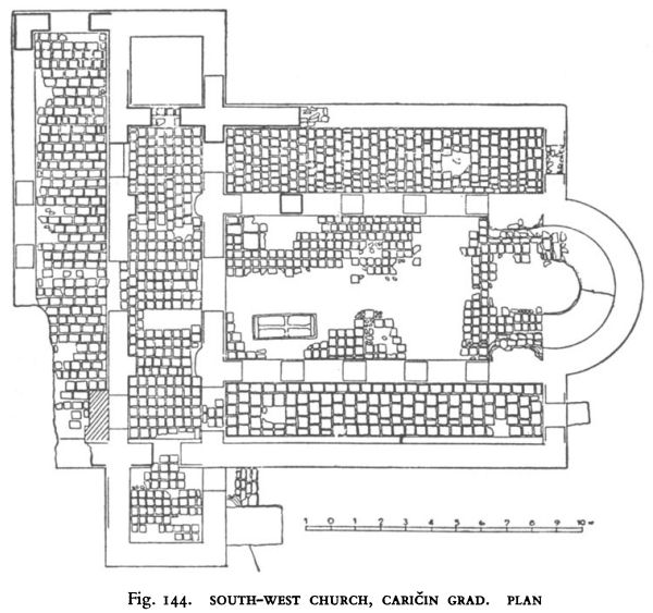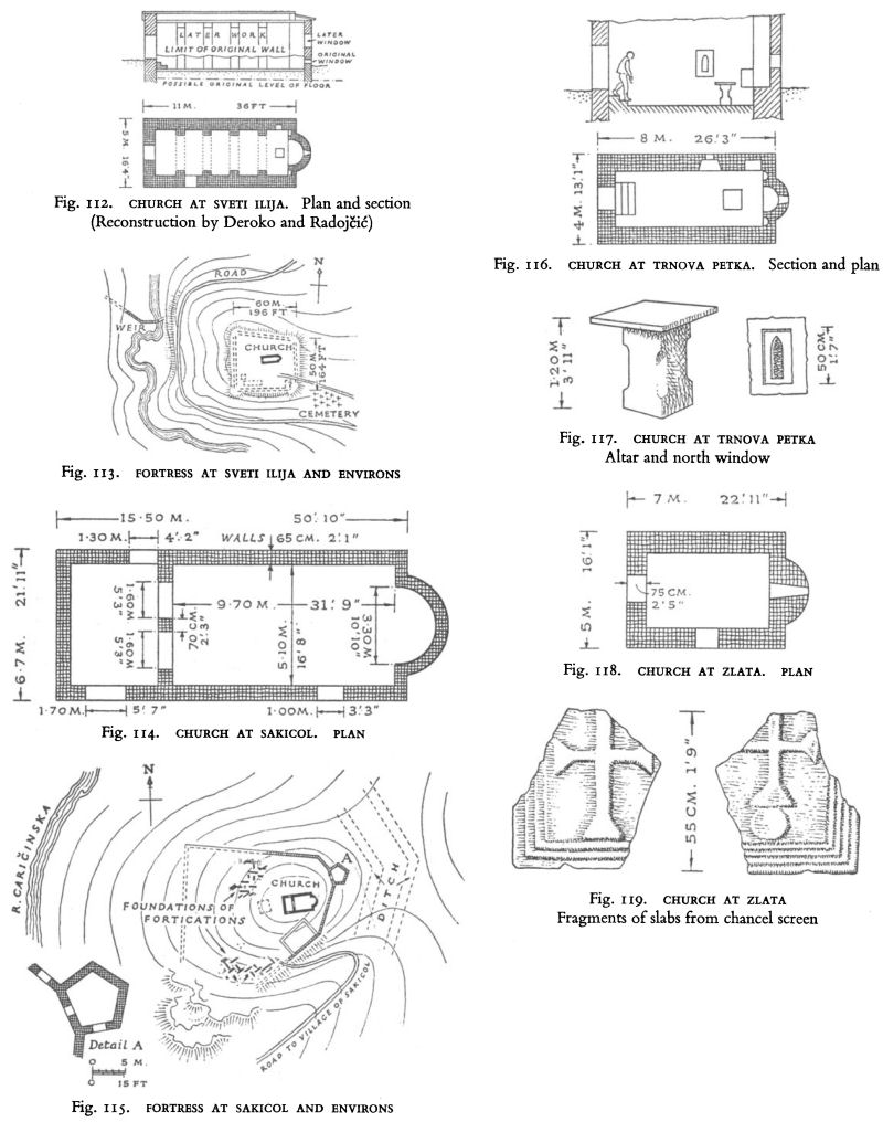 At least five single-naved churches belonging to the sixth century have been excavated in the locality : at Sveti Ilija (Figs. 112, 113) sited on a fortified hillock on the outskirts of Caričin Grad, at Sakicol (Figs. 114, 115),