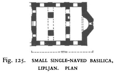 Three different types have been identified as dating from the sixth century : basilical, cruciform and single naved. The church at Svinjarica (Fig. 102) is a basilica with a nave and two aisles, one, possibly more protruding apses, rounded inside but with a three-sided exterior, a narthex and an exonarthex. The exonarthex, of which little has survived, is divided into three parts, corresponding to the nave and aisles, and Petković, who excavated it, remarks that it probably comprised two towers flanking a portico. A tribelon connects the narthex and the nave and there are no signs of a closed sanctuary or of parabemata. Brick was used for the walls and for the piers lining the nave. These piers present a cruciform shape through having pilasters on each of their four sides.