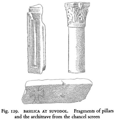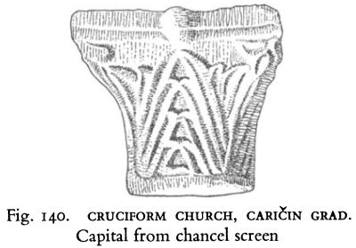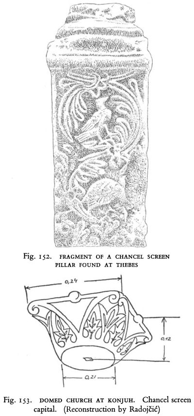 An aspect of the sculptural decoration of the two churches calling for notice concerns the capitals of the chancel screen at Konjuh and the Ionic-impost capitals of the South Church. The accentuated ‘V’ line, ending in spiralling relief volutes, is common to both, although one is clearly not a copy of the other. This decorative detail, like that on the Ionic-impost capitals of the Episcopal Church of Caričin Grad, recalls an eastern Anatolian motif. [1]