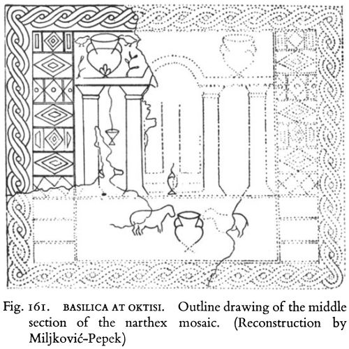 As at Studenčišta and Radolišta the nave and narthex had mosaic floors. In the narthex the decoration of the two sections corresponding to the aisles was again purely geometrical. The middle section, which in spite of extensive damage Miljkovic-Pepek has been able to reconstruct in outline, presented, however, a symbolism quite different from those of the other two churches. Approaching it from the west, in the foreground two opposed lambs stood each side of a cantharus. Behind them rose four columns carrying an architrave, the central section being arched. Standing on the flat part of the architrave on each side of the arch (presumably, for only one side has been preserved) was a large cantharus from which two rather small birds, standing on trees or branches, appeared to be drinking (Fig. 161).