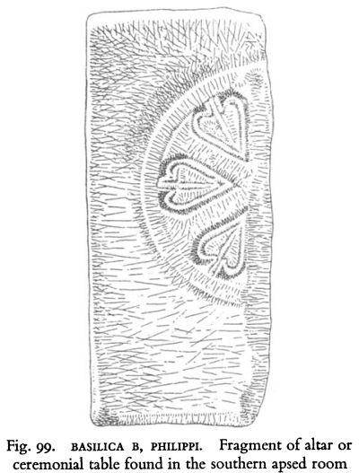 Fig. 99. BASILICA B, PHILIPPl. Fragment of altar or ceremonial table found in the southern apsed room
