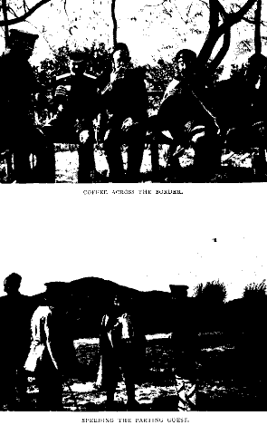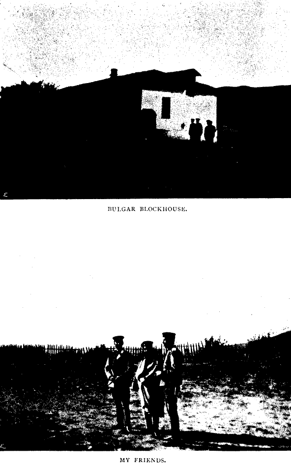 Evenings with Bulgarian officers are trying even to the strongest constitution, but how merry! Then it was that we expressed our desire to ride to the frontier, and lo! two officers, an orderly and a troop horse, awaited us this morning. We climb the last ridge slowly, for it is steep, towards the two block-houses, scarcely a hundred yards apart, upon its summit. Bulgar sentries, in long great-coats and flat caps, march smartly to and fro with fixed bayonets, watchful, keen, alert. A few yards away loll the Turks, in hated fez and ragged uniform. There are 200 of them behind the Turkish block-house, outnumbering the Bulgars by six to one. "Rather heavy odds," we remark; but the bearded lieutenant and commandant of this lonely station only smiles. "We are not afraid," he says, and conducts us into his quarters, whilst soldiers swiftly discover tablecloths, glass, and other accessories for the much-needed meal. A ride of twenty miles across the high-lying downs creates healthy