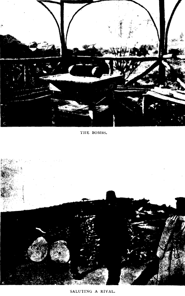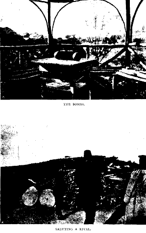 The time passes quickly and pleasantly. We are shown captured bombs, heavy cylinders used for blowing up buildings, and the dreaded hand grenade, whose short fuse is calmly ignited by a burning cigarette and hurled amongst the attacking Turks. A man must indeed have nerves of iron to do this deed. Picture a devoted handful of men surrounded by an overwhelming force of infuriated Turks slowly but surely drawing ever nearer. Now they are a hundred yards away, fifty yards - luckily they shoot abominably - but it is too far to "put the weight" with effect. They must wait, though here and there a bullet aimed at random thins out the little band. A rush - Now. See! one coolly lights the fuse, and quickly hurls it at the foe. He must make no mistake, his aim must be correct and his arm strong. A slip at the moment of throwing means his and his comrades' lives instead of the Turks', for the fuse is very short. But he has thrown well; the Turks see it coming, and halt in blind fear. A deafening crash, screams and yells of anguish, and the Turks break and run, shot down by the triumphant insurgents. Down into the valleys they fly, to the nearest village, where their officers, anxious to save to themselves a semblance of authority, order its massacre and pillage. And next day we read of the extermination of another band.