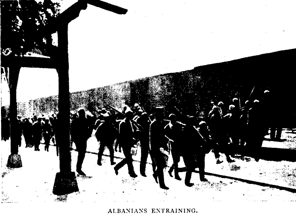 "snapping" a regiment of particularly mutinous Albanians entraining at the station. I had secured three or four pictures when the commanding officer noticed me and sent his adjutant to request me to desist. At that moment a particularly good picture struck me, and politely asking the officer to repeat the remark, I snapped the scene.