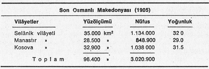 Son Osmanlılar devrinde ise Makedonya denilince, Rumeli’deki üç Osmanlı vilâyeti anlaşılırdı: Selânik vilâyeti, Manastır vilâyeti ve Kosova vilâyeti... Bu vilâyetlerin son Osmanlı devrinde, yüzölçümleri değilse de, demografik ve etnografik durumları, yani nüfuslarıyîe, bu nüfusu terkip eden halklar hakkmdaki rakamlar biraz çelişmelidir. Bir de, Makedonya’da nüfuslar verilirken, Türk ve Arnavutları, din iştirakleri dolayısıyle tek kalemde göstermek alışkanlığı, halklar tablosunun ayırımında güçlükler yaratmaktadır. Bu noktayı belirttikten sonra şimdi, son Osmanlı Makedonyası vilâyetlerinin, önce yüzölçümleriyle nüfus tahminlerini verelim (1) :