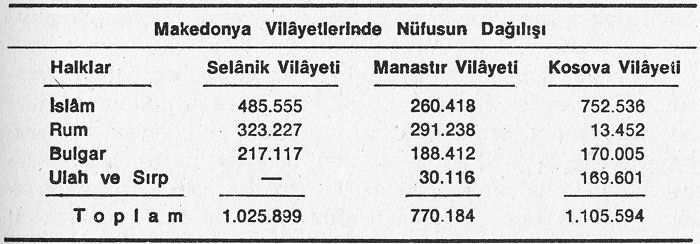 Bu nüfus yekûnlarını, sadece bir fikir verici olarak almak doğru olur. Gerçi Makedonya vilâyetlerinde ve 1908’den önce, yabancı devletlerin de ilgileri altında nüfus derlemeleri yapılmıştır. Ama bunların, bugünkü anlamda tam bir nüfus savımı teşkil etmediğini kabul etmeliyiz.