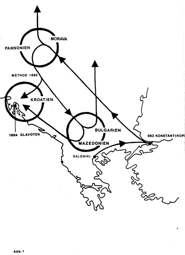 Werfen wir, um die topographischen Verhältnisse dieser beiden Schriften auf kroatischem Boden im Laufe der Jahrhunderte besser zu verstehen, einen Blick auf die Karte (Abb. 1), die die wichtigsten Daten knapp zusammengefaßt darstellt. Das ist eine topographisch-mnemotechnische Skizze mit den Wegen, die die Glagolica genommen hat, die uns aber auch daran erinnert, daß die Protagonisten der ersten slawischen Literatursprache und der ersten dieser Literatursprache adäquaten Schrift, der Glagolica, die Brüder Kyrill und Method, Griechen aus Saloniki waren, die im Jahre 863 mit einer Gruppe von Schülern und ins Slawische übersetzten Büchern aus Byzanz zur Mission nach Morava aufbrachen.