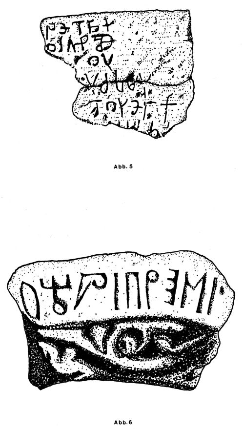 Der Weg aus dem Süden aber ist von Denkmälern markiert. Er führt von Makedonien, von Ochrid und Sveti Naum über Zahumlje (Humac, Abb. 4), Dalmatien (Plastovo, Abb. 5; Knin, Abb, 6) bis zur Insel Krk (Baščanska ploča). Alle diese Denkmäler stammen aus dem 11. bzw. 12. Jh. und gehören zur zweiten Welle mit der die Glagolica gemeinsam mit der Kirilica aus dem Süden nach Kroatien kam. Und de facto kreuzen und vermischen sich in diesen Inschriften auch die graphischen Systeme dieser beiden Schriften. Die glagolitischen und kirilischen Buchstaben werden - einmal mehr und einmal weniger - miteinander kombiniert. So ist z.B. die Tafel von Baška im Prinzip ein glagolitisches Denkmal, aber