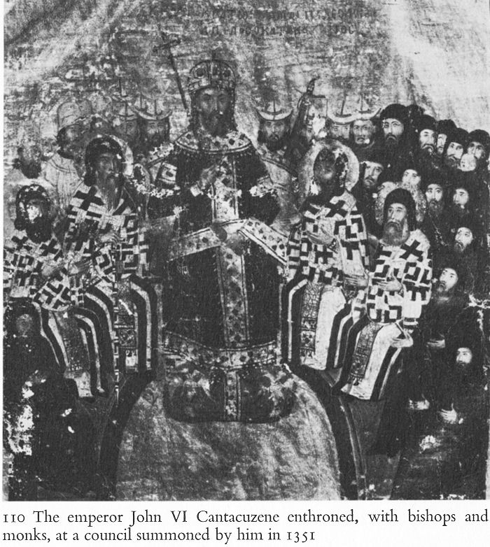 110 The emperor John VI Cantacuzene enthroned, with bishops and monks, at a council summoned by him in 1351