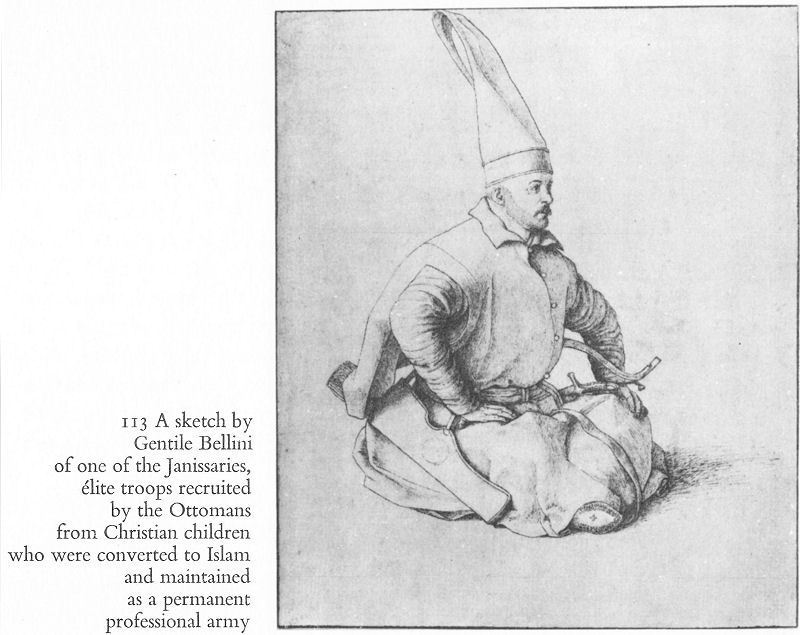 113 A sketch by Gentile Bellini of one of the Janissaries, elite troops recruited by the Ottomans from Christian children who were converted to Islam and maintained as a permanent professional army